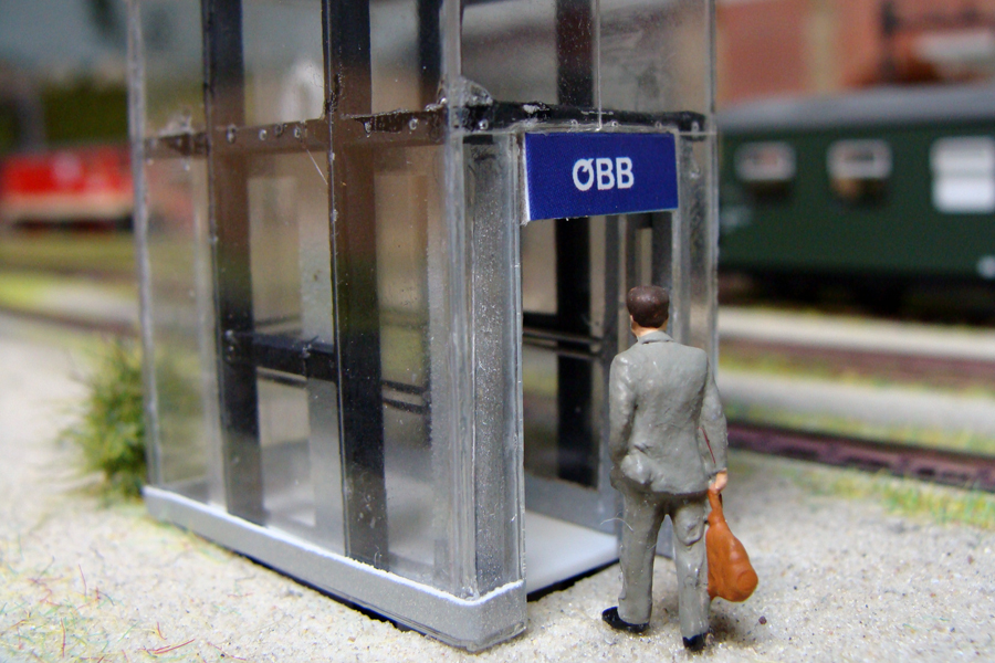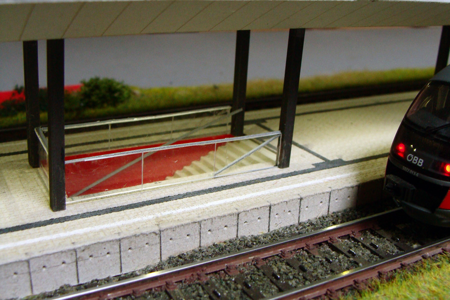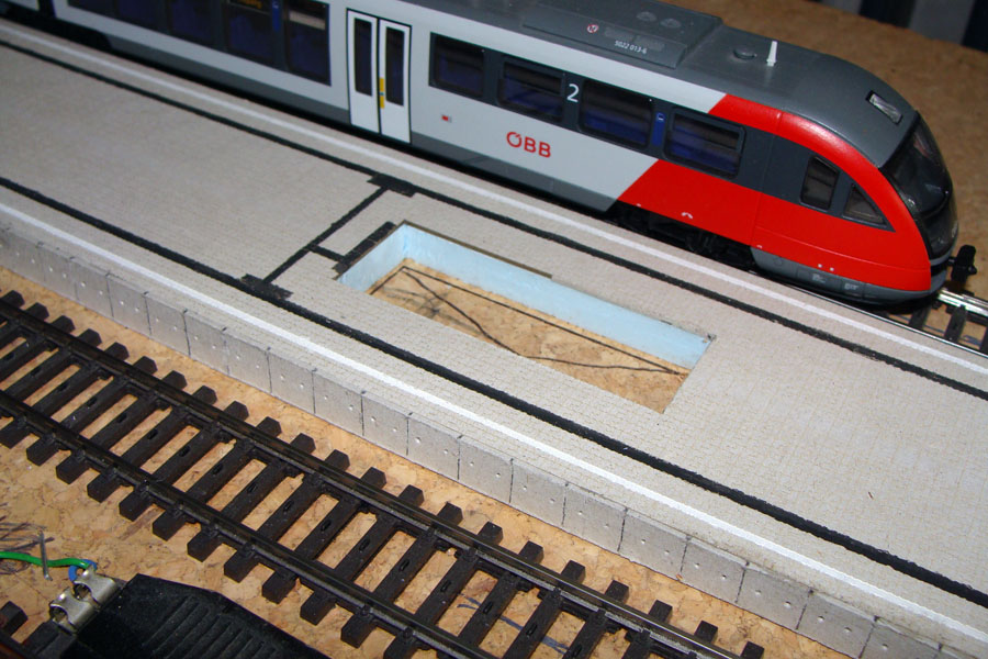 Die Vorbild-Bahnsteige der ÖBB hatte ich vermessen und fotografiert, auch die Katalogabbildung einer Zementfabrik hatte ich zur Verfügung. So konnte ich die exakte Epoche-VI-Bahnsteigpflasterung mit dem Programm Illustrator nachkonstruieren, was nicht wenig Arbeit war...