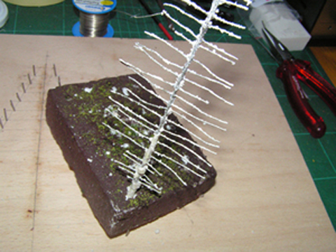Auf einer Sperrholzplatte werden Nägel in kurzen Abständen entlang der gewünschten Baumsilhouette eingeschlagen. Die Köpfe werden abgezwickt, damit der Baumrohling später leicht abgenommen werden kann.