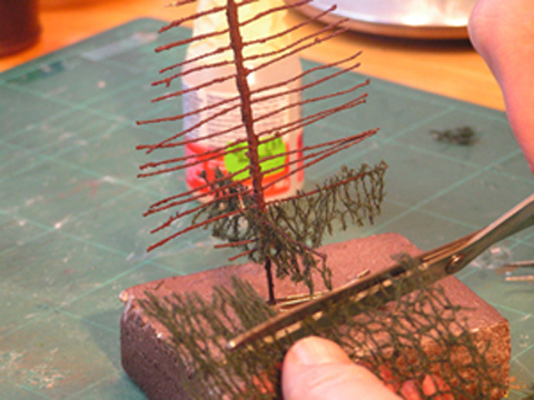 Sein Nadelkleid erhält unsere Fichte mit dem Benadelungsmaterial der Firma Silhouette. Zum Zeitpunkt dieser Aufnahme war das Benadelungsmaterial noch recht dünn und musste doppelt genommen werden. Mittlerweile hat es eine schöne Dichte.