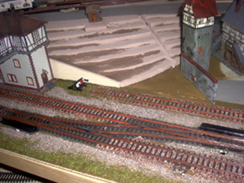 Stützmauern und die Stiege fertige ich aus geprägtem Mauersteinkarton (Faller oder Vollmer). Die Terassen werden mit grünem Streumaterial bepflanzt.
