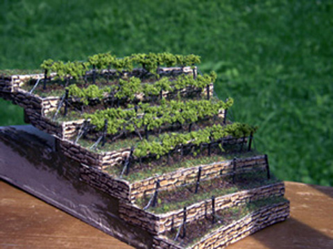 Aus Styrodurplatten schneide ich die Weinbergterassen und verklebe sie mit Styroporkleber. Die Weinbergelemente werden zur leichteren Bearbeitung und späteren Wartung herausnehmbar eingesetzt.