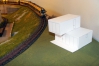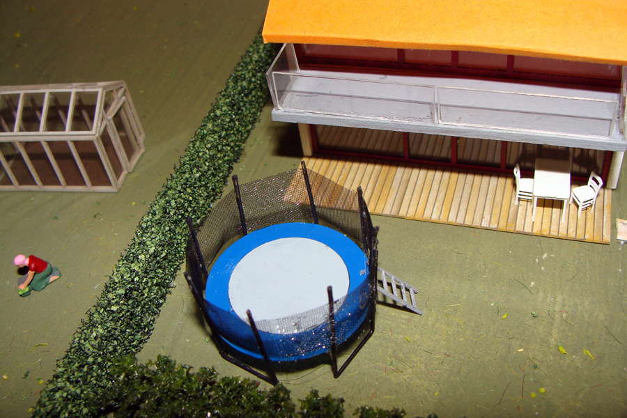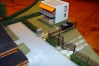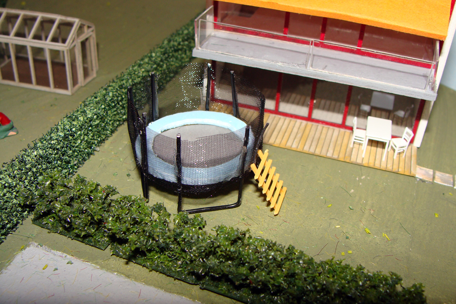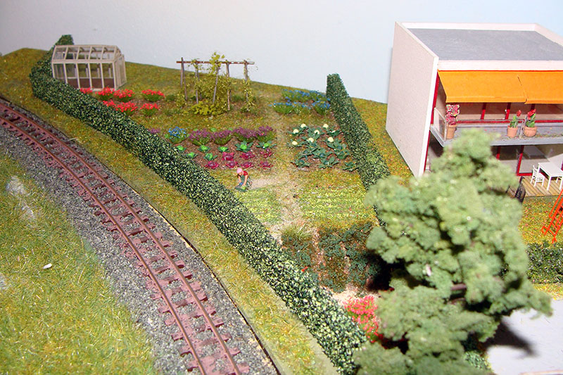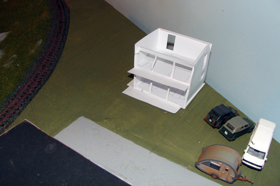 Hinter dem modernen Bungalow werden Schrebergärten entstehen. Hier das Papiermodell eines Kleingartenhauses in moderner Architektur.