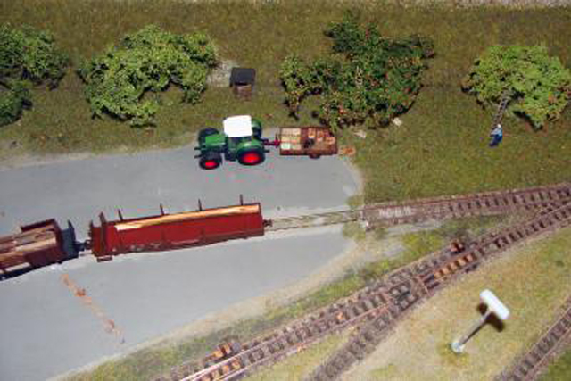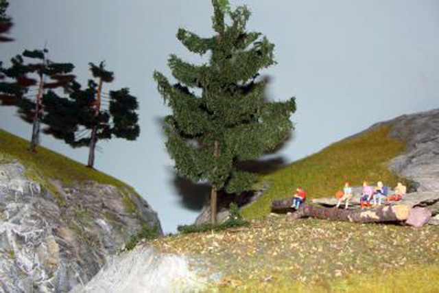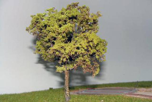 Eine Linde entstand aus gedrilltem Blumenbindedraht. Darauf kam eine Schicht Farbe, mit Vogelsand vermischt. Die Belaubung entstand aus verschiedenen Beflockungsmaterialien.